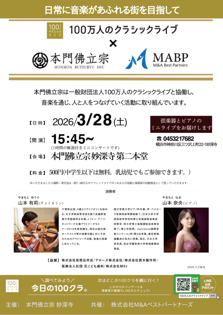 3月28日(土) 15時30分より、妙深寺の第二本堂にて「100万人のクラシックライブ」を開催いたします。